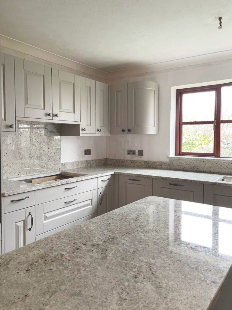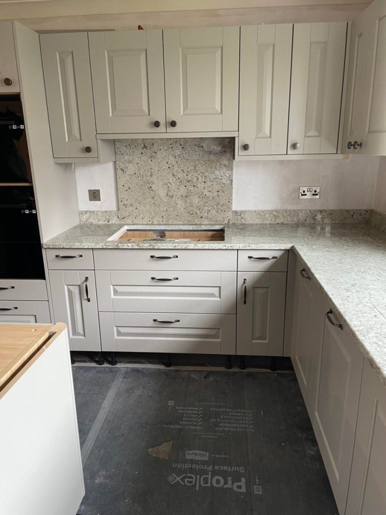 Welcome to this Colonial White Polished Sensa Granite Worktops portfolio page of MGD, the leading stone fabricator in Herefordshire. We are proud to showcase our recent project of creating bespoke granite worktops, splashbacks, and window sills for a residential kitchen using Colonial White Polished Sensa Granite.