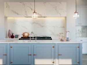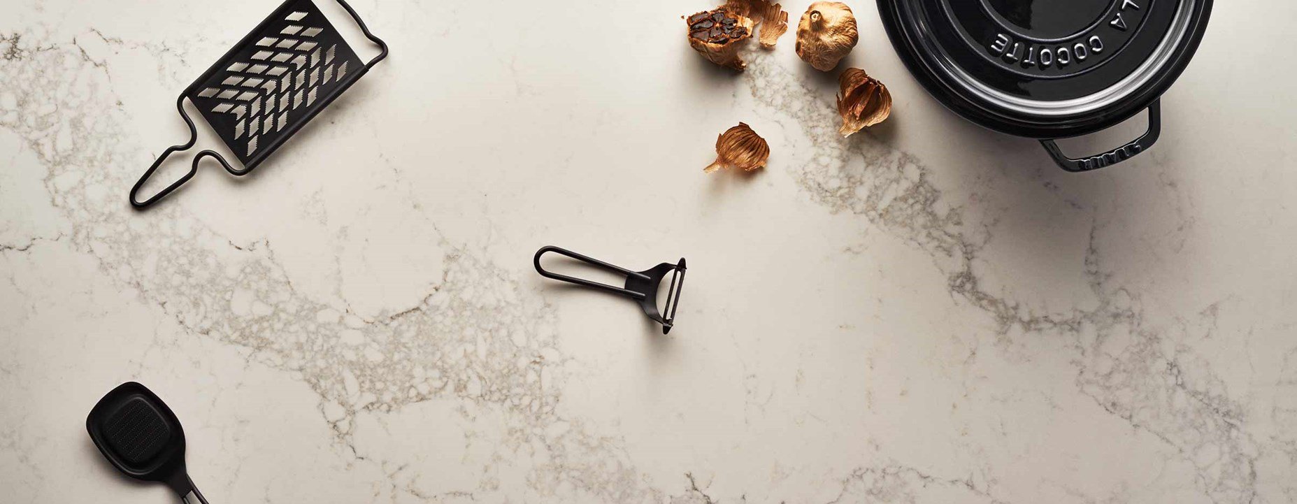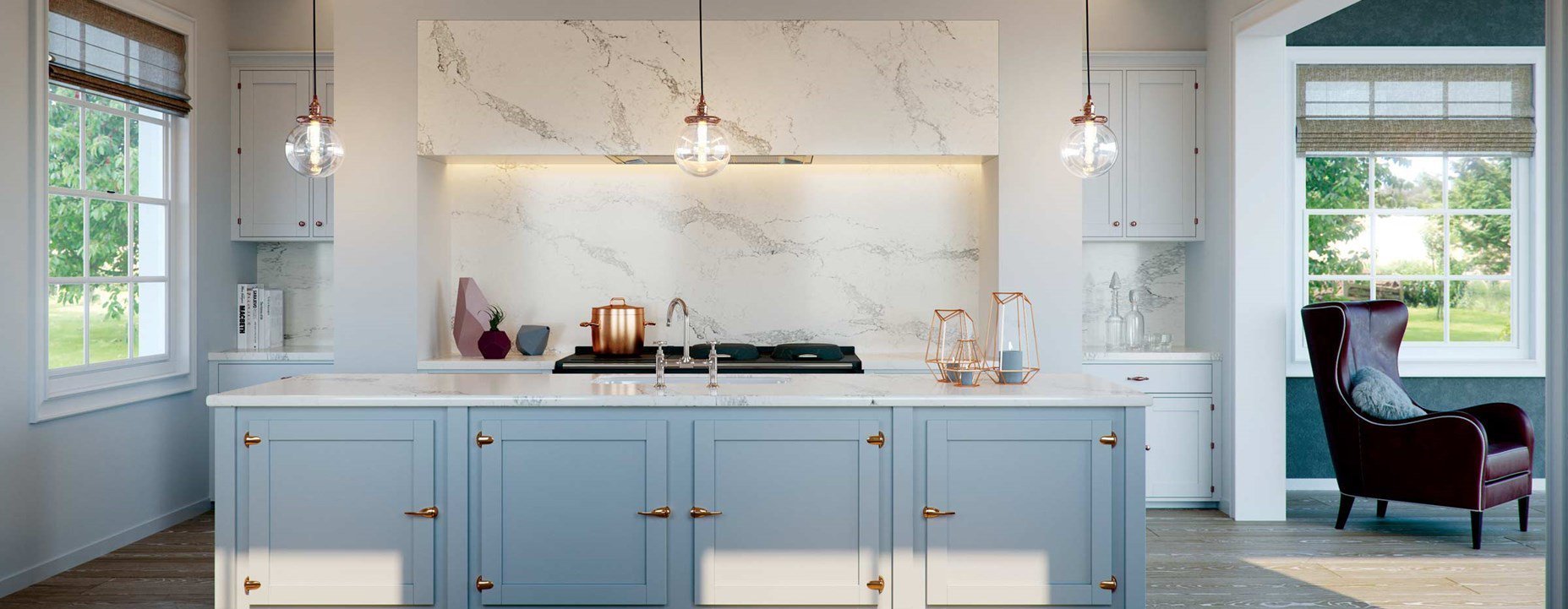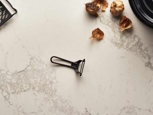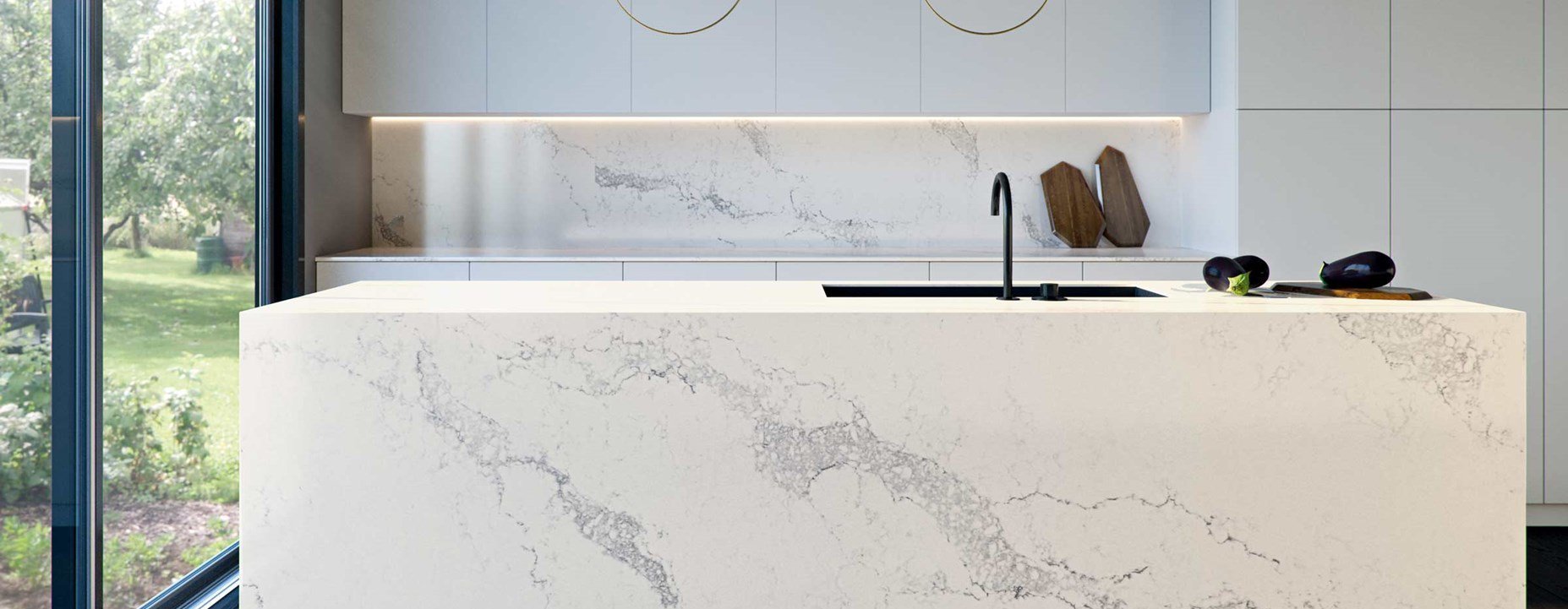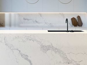 Caesarstone’s 5031 Statuario Maximus is a stunning quartz worktop that brings the classic elegance of marble to any space. This worktop features a feathered dove-white base adorned with broad, light-grey veins that create a clouded swirl effect. The veins appear deeply absorbed into the surface, reminiscent of natural marble’s misty beauty. The polished finish enhances its luxurious appearance, adding a smooth and reflective quality that brightens any room.
