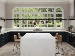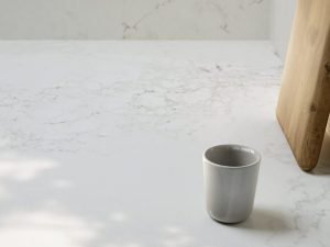 Caesarstone 5121 Layalite is a beautiful quartz worktop that evokes the pristine beauty of freshly fallen snow, gently melting to reveal the rough greys and ochres of underlying metamorphic rock. This surface’s design is characterized by broad, soft veining that brings an emotive and natural look to any space. The honed finish adds a smooth, velvety texture, enhancing its tactile allure and making it a perfect choice for kitchens, bathrooms, and other interior applications.