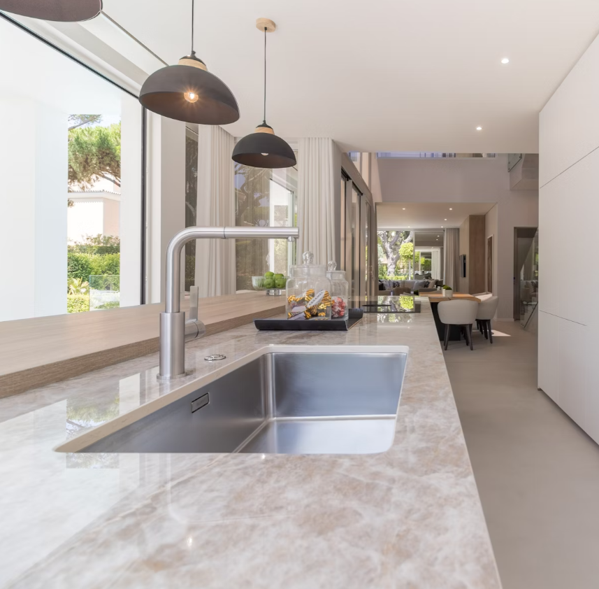 Arga allows for seamless installations across large areas, in various thicknesses and large formats, minimizing joints and enhancing continuity. Its polished finish intensifies the colour and luminosity, making it an ideal surface for those seeking to create spaces of unmatched beauty and elegance. Dekton Arga offers durability, low maintenance, and a timeless aesthetic, whether applied to countertops, flooring, or as a striking facade.
