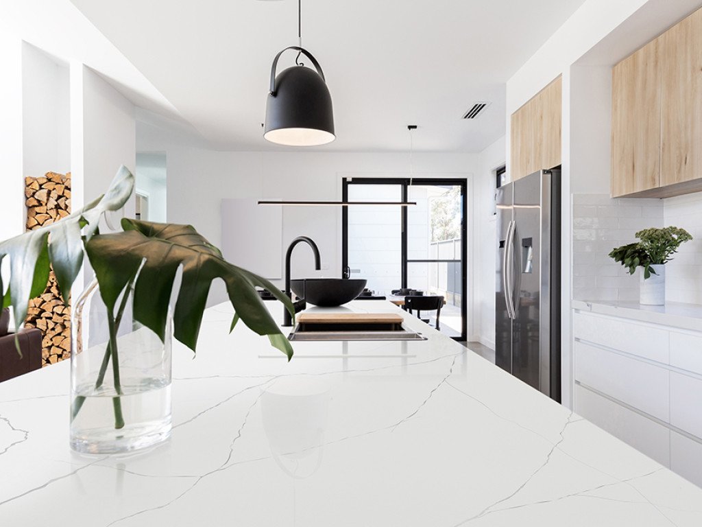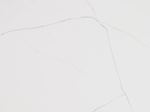 Noblesse White is a white quartz worktop from Diresco with contrasting flecks and grey, marble-style veins throughout.